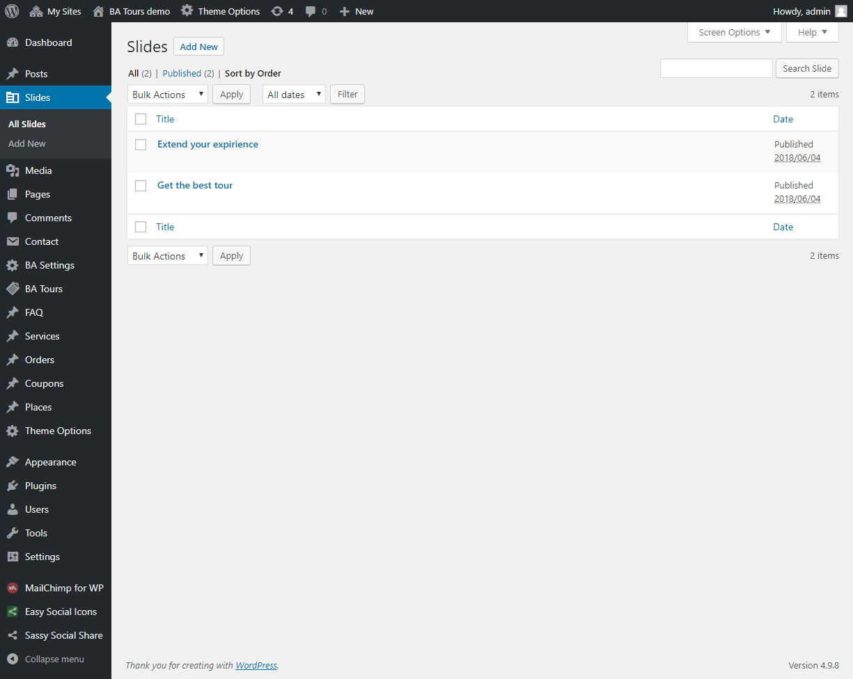 BA Tours theme provides plenty of options divided into several sections. In the list below, we will give you an overview.