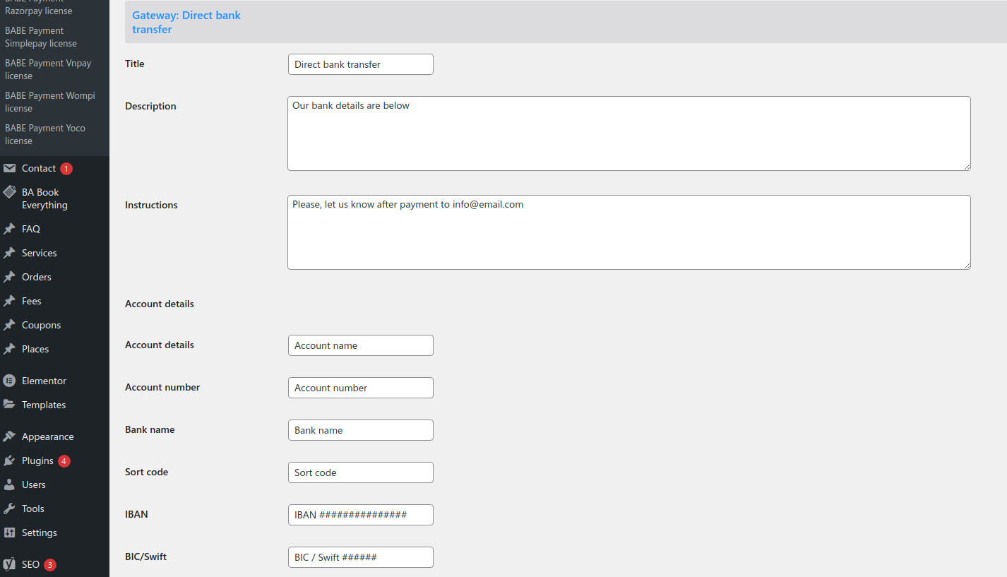 Added a Bank transfer payment option into BA Book Everything plugin: show bank transfer details on checkout, order confirmation and in the customer email.